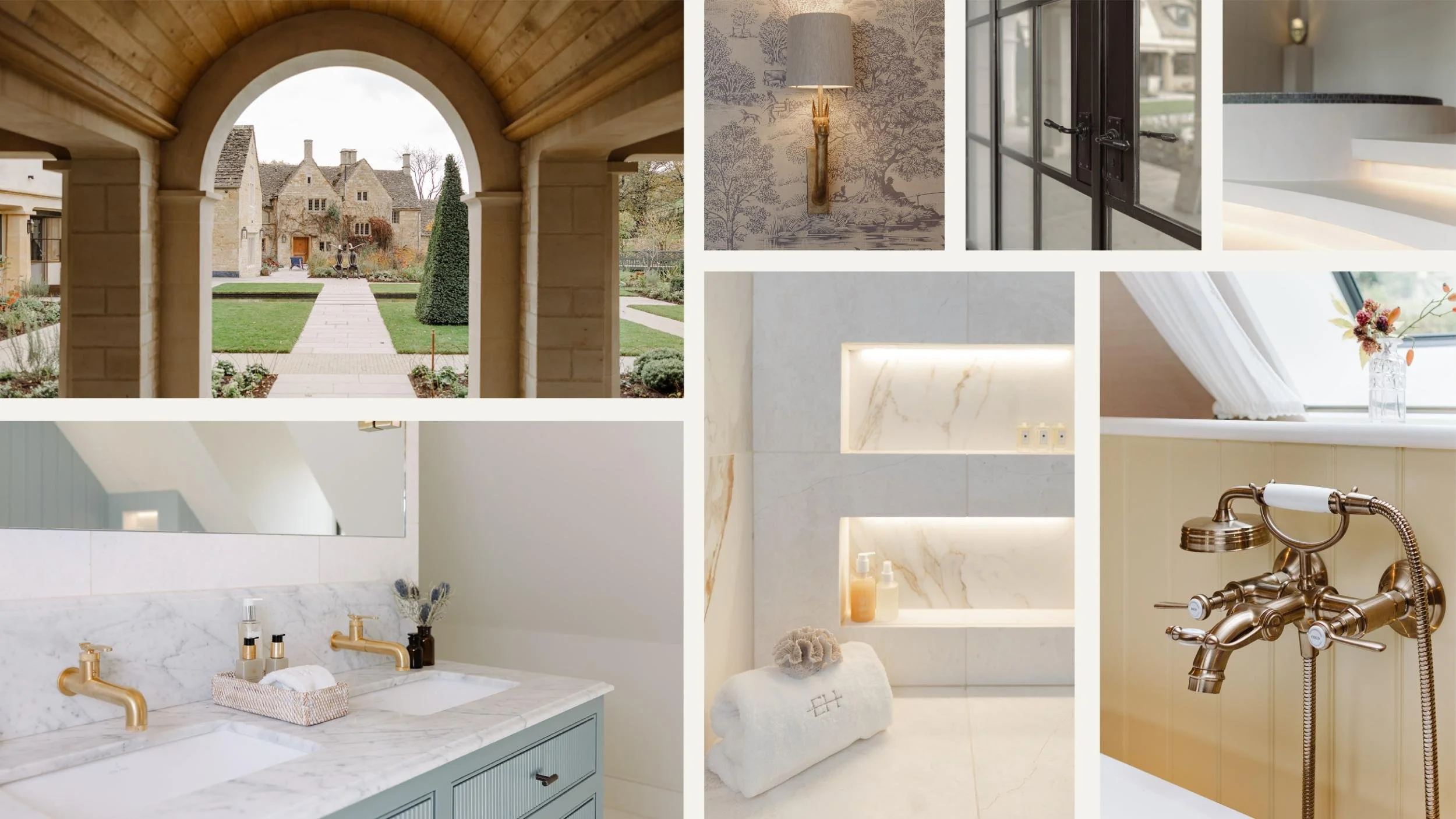 In collaboration with Yiangou Architects, this Cotswolds home was thoughtfully extended, harmoniously balancing old and new. The new space provides the client with two new guest suites for their growing family, a light-filled art studio and a wellness centre overlooking the meticulously landscaped gardens. The soft pastel palette, mixed metals and honed stone created the feminine, whimsical feel the client was after and beautifully contrasts the natural Cotswolds exterior.